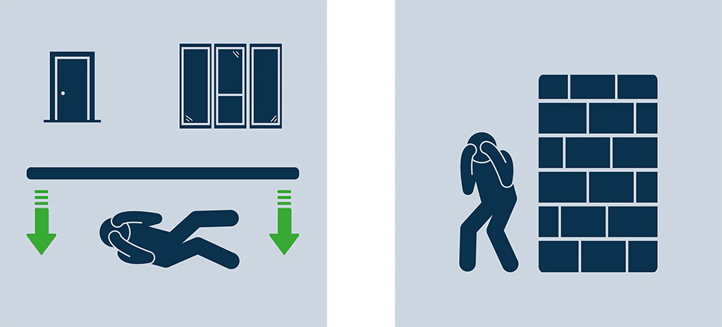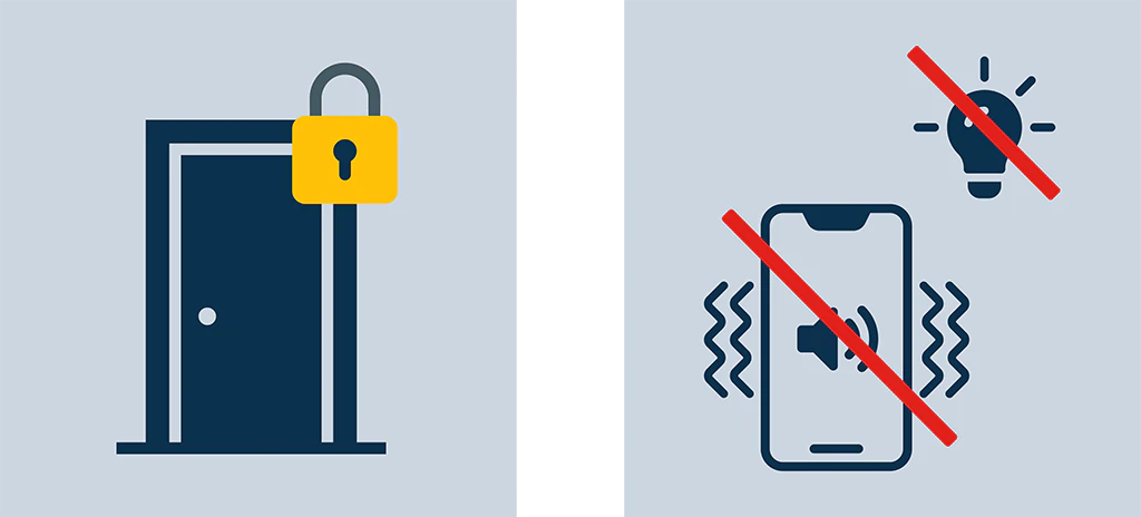 Turn off the light and silence your phone (sound and vibration).Move away form doors and windows, and lie down on the floor.