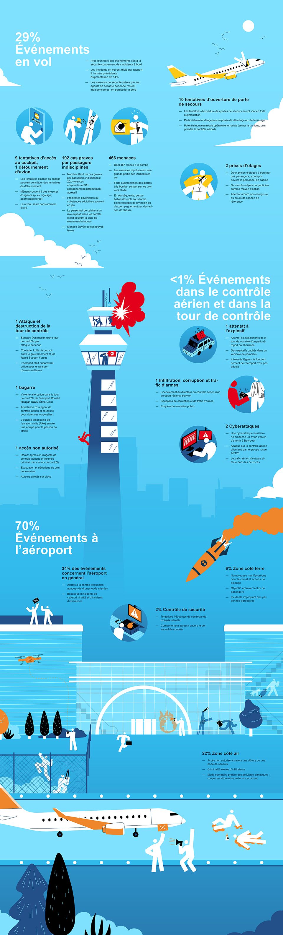 Quelle était la situation en matière de sécurité aérienne en 2024 au niveau mondial ? Cette infographie offre un aperçu des événements analysés par fedpol entre mai 2024 et avril 2025 :