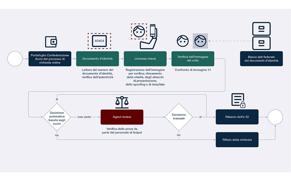 La persona che richiede un’e-ID tramite l’applicazione Swiyu, messa a disposizione dalla Confederazione, deve scansionare il proprio documento d’identità e trasmettere le seguenti informazioni: cognome, nome, data di nascita e numero di documento d’identità. In seguito registra nell’applicazione un video del proprio volto. Ciò permette di verificare che si tratti effettivamente di una persona («liveness-check») e di estrarre una foto di riferimento che consenta la verifica dell’identità. La verifica avviene confrontando questa foto con quella contenuta nei registri ufficiali. Se i dati corrispondono, la persona richiedente riceve immediatamente l’e-ID sul proprio smartphone. Tale processo dovrebbe richiedere solo pochi minuti. Se la persona non intende effettuare la verifica online, può eseguirla anche presso l’ufficio dei passaporti del suo luogo di domicilio.